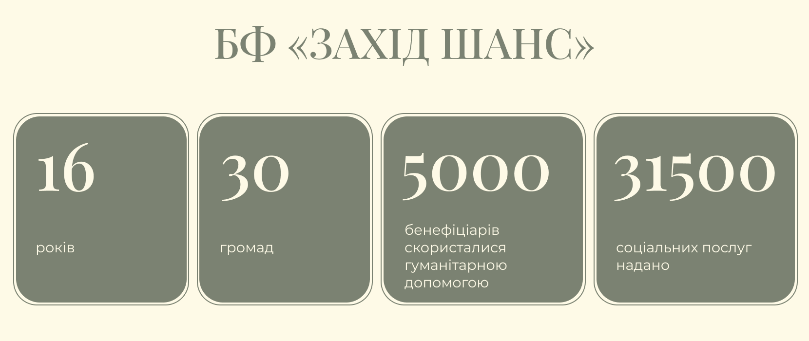 Благодійна організація «Благодійний фонд «ЗАХІД ШАНС» працює в Івано-Франківську вже 16 років. За цей час налагодили постійну співпрацю із міжнародними донорами та місцевою владою, а також охопили своєю діяльністю 30 громад у своїй області. Щороку тільки за напрямком профілактики ВІЛ команда БО надає послуги понад 3,5 тисячі людей. І в тому, що з 2009-го захворюваність на Прикарпатті знизилася в декілька разів – теж її велика заслуга. Ще 5000 бенефіціарів скористалися гуманітарною допомогою від організації — її надавали у вигляді сертифікатів на продукти харчування та міні-грантів. Тільки з початку цього року команда надала близько 31500 соціальних послуг у своєму регіоні.